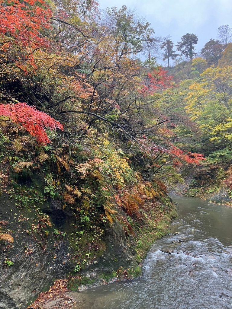 鳴子峡 観光スポット X Facebook はてブ Pocket LINE コピー 2024.11.16 大谷川の清流沿いの、中山平口から下流の鳴子峡口に渡る峡谷です。あいにくの雨模様でしたが到着時は雨も止み、曇り空でしたが雨に洗い流された木々の紅葉が鮮やかです。レストハウスから遊歩道を川沿いに歩き、渓谷の奥まで散策でき紅葉に囲まれた世界が広がります。
